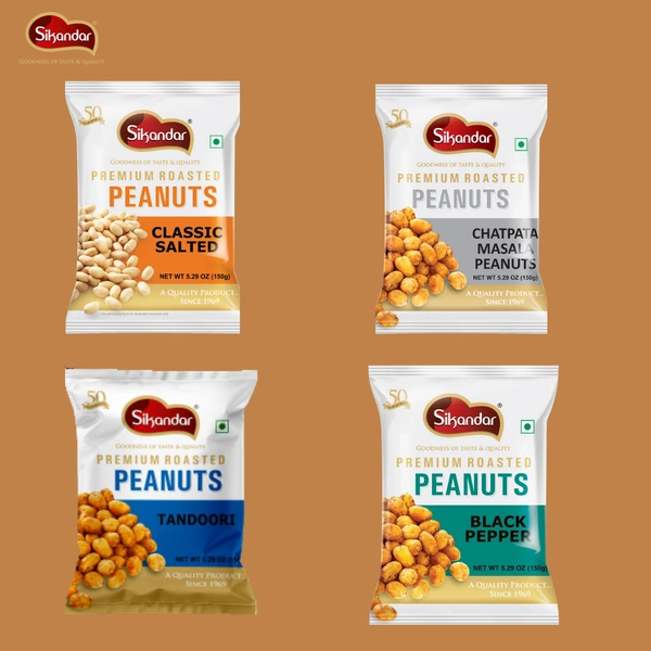 Savor the ultimate taste experience with the Sikandar Brand Premium Roasted Peanuts Combo Pack. This thoughtfully curated selection includes four irresistible flavors: Classic Salted, offering timeless simplicity; Chatpata Masala, bursting with tangy, spicy goodness; Tandoori, infused with smoky, bold spices; and Black Pepper, delivering a zesty kick. Each flavor is crafted with Sikandar Foods' signature 100% even roasting process, ensuring unmatched crunch and flavor in every bite. Perfect for every occasion, this premium combo is a delightful treat for snack lovers seeking variety and quality.