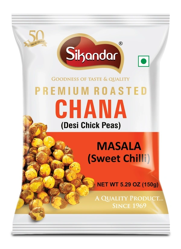 Sweet chilli masala chana online | Chatpata roasted chickpeas buy | Sweet & spicy masala bhuna chana | No onion no garlic masala chana | Roasted chana sweet chilli flavor 150g | Tangy masala chickpeas namkeen | Sikandar sweet chilli chana | Desi chickpeas chatpata masala